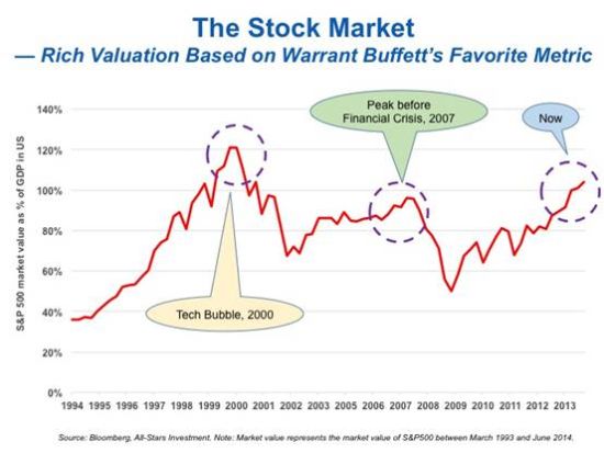 在过去20年中,这一指标接近或者超过100%发生过两次分别是1999-2000年和2007-2008年,而与之对应的分别是第一次互联网 泡沫破裂和2007-2008年的经济危机。过去5年的美股大牛市已将这一指标又一次拉到了100%,虽然还没有达到互联网第一次泡沫时期的120%,但 回调或许已经接近 — 巴菲特现在的资产中,现金的比例已达到历史最高,这或许也是一种信号。